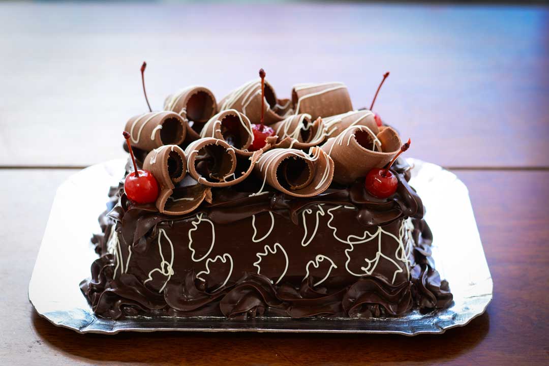 Cobertura: raspas de chocolate preto, ganache preto, riscos brancos na decoração e cereja.