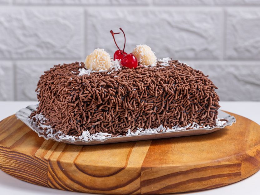Cobertura: calda de chocolate preto, granulado preto, coco ralado e cerejas.
